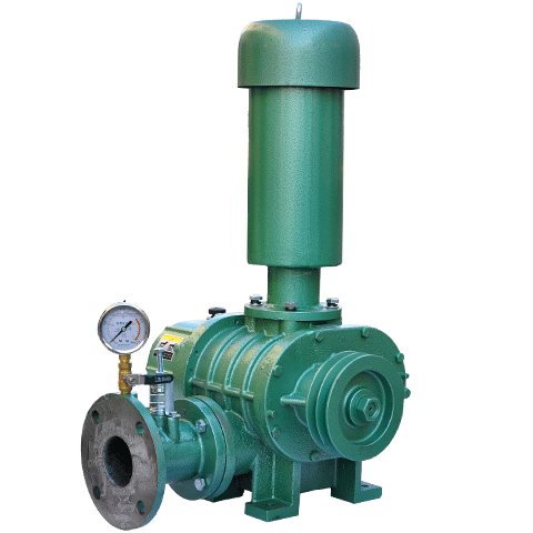 羅茨風機為容積式風機,輸送的風量與轉 數(shù)成比例,三葉型葉輪每轉動一次有2個葉輪進行3次吸、排氣,與二葉型相比,氣體脈動變少,負荷變化小,機械強度高,噪聲低,振動也小。
